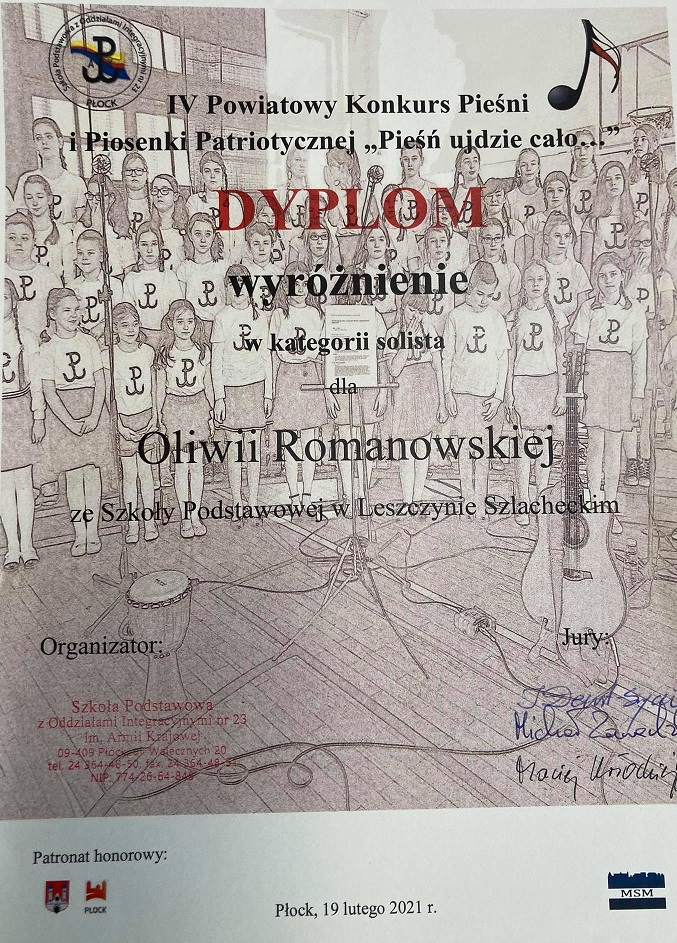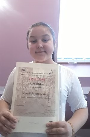 Oliwia Romanowska otrzymała wyróżnienie w IV Powiatowym Konkursie Pieśni i Piosenki Patriotycznej "Pieśń ujdzie cało...". Gratulujemy!