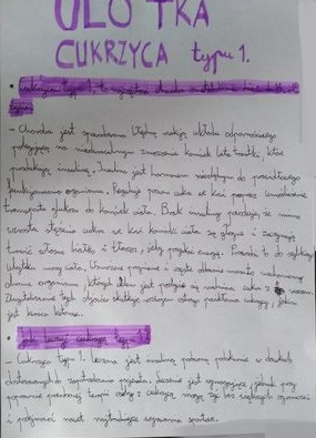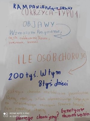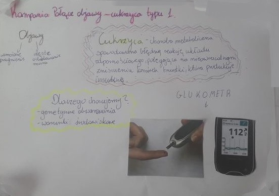 Uczniowie klasy 1 oraz klas 5-8 wzięli udział w projekcie Polskiego Towarzystwa Chorób Autoimmunologicznych „Kampania Połącz objawy…cukrzyca typu 1, najczęściej występująca choroba metaboliczna u dzieci.” Celem projektu jest zwiększenie świadomości społecznej dotyczącej pierwszych objawów cukrzycy typu 1. Szacuje się, że w Polsce choruje na nią około 200 tysięcy osób w tym około 8000 dzieci. Średni wzrost zachorowań określany jest na 3% w skali roku. Przyczyną tej autoimmunologicznej choroby jest nieodwracalne zniszczenie komórek odpowiedzialnych za produkcję insuliny. Według badania „Społeczny obraz cukrzycy” 10% populacji ogólnej nie zna żadnych objawów cukrzycy, a zaledwie 3% urzędników państwowych potrafi wskazać poprawnie pierwsze symptomy. Charakterystyczne dla cukrzycy typu 1. oznaki: utrata masy ciała, nadmierne oddawanie moczu i pragnienie wskazało odpowiednio 15%, 29%, 42% ankietowanych. Z powodu nieświadomości pierwsze objawy często mylone są przez rodziców oraz pracowników ochrony zdrowia z innymi chorobami takimi jak infekcja brzuszna. W rezultacie w Polsce 25% nowo rozpoznanych dzieci przyjmowanych jest w stanie zagrożenia życia zwanym kwasica ketonowa, która związana jest z późną diagnozą.