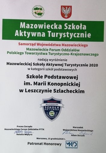W grudniu została rozstrzygnięta V edycja konkursu „Mazowiecka Szkoła Aktywna Turystycznie” organizowanego przez Mazowieckie Forum Oddziałów PTTK , Marszałka Województwa Mazowieckiego pana Adama Struzika, Patronat Honorowy Mazowieckie Kuratorium Oświaty. Do konkursu zgłosiło się 9 szkół podstawowych, 5 szkół ponadpodstawowych, 1 szkoła specjalna. Nasza szkoła zdobyła wyróżnienie i prawo używania logo „MAZOWIECKA SZKOŁA AKTYWNA TURYSTYCZNIE 2020”.
