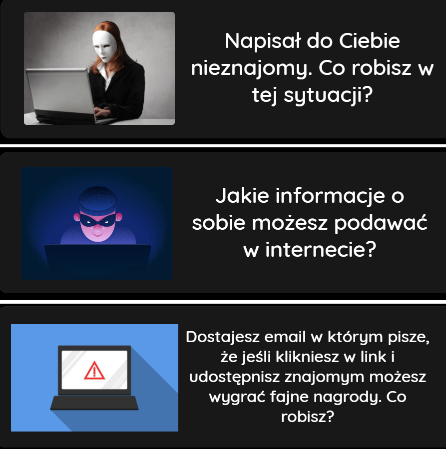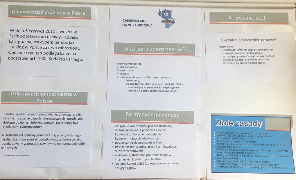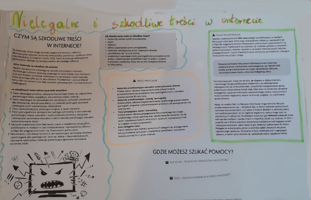 Z podobną tematyką zapoznali się uczniowie kl. VII-VIII realizując kursy „Cyberprzemoc”, „Cyfrowe ślady”, „Fake news, dezinformacja w sieci” oraz „Nielegalne i szkodliwe treści w internecie” w ramach projektu edukacyjnego „Przystań w sieci”, który powstał z inicjatywy Facebooka, NASK PIB i UNICEF Polska.