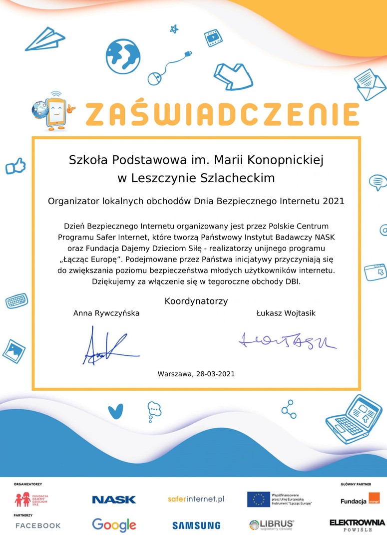 Uczniowie kl. IV-V grali w grę przygodową Interlandia, dzięki której poznali zasady bezpieczeństwa w internecie i odpowiedzialnego udziału w internetowej społeczności. W trakcie gry dzieci zmagały się się z hakerami, wyłudzaczami danych, niedyskretnymi udostępniaczami i hejterami. Uczniowie klasy VI wzięli udział w kursie e-learning „Gdzie jest Mimi?”, podczas którego zapoznali się z aspektami cyberprzemocy oraz sposobami radzenia sobie z nią. Uczestniczyli również w konferencji online Asów Internetu, na której uczyli się o cyberbezpieczeństwie i wartościach Asów Internetu.