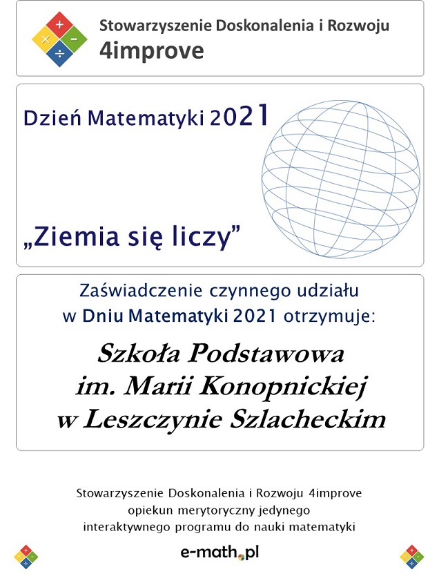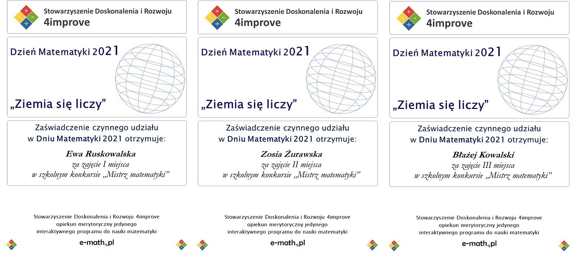 Uczniowie naszej szkoły wzięli udział w Ogólnopolskim Dniu Matematyki, którego inicjatorem jest Stowarzyszenia Doskonalenia i Rozwoju 4improve. W tym roku hasło przewodnie brzmiało „Ziemia się liczy”, a więc zadania były powiązane z naszą planetą. Począwszy od 12 marca wszyscy rozwiązywali zadania udostępniane podczas wideoczatów w postaci interaktywnej prezentacji zawierającej pytania. Po podsumowaniu wszystkich wyników okazało się, że szkolnym mistrzem matematyki została Ewa Ruskowalska (kl. VI), a wicemistrzem Zosia Żurawska (kl. VI). Na III miejscu uplasował się Błażej Kowalski z kl. VII.