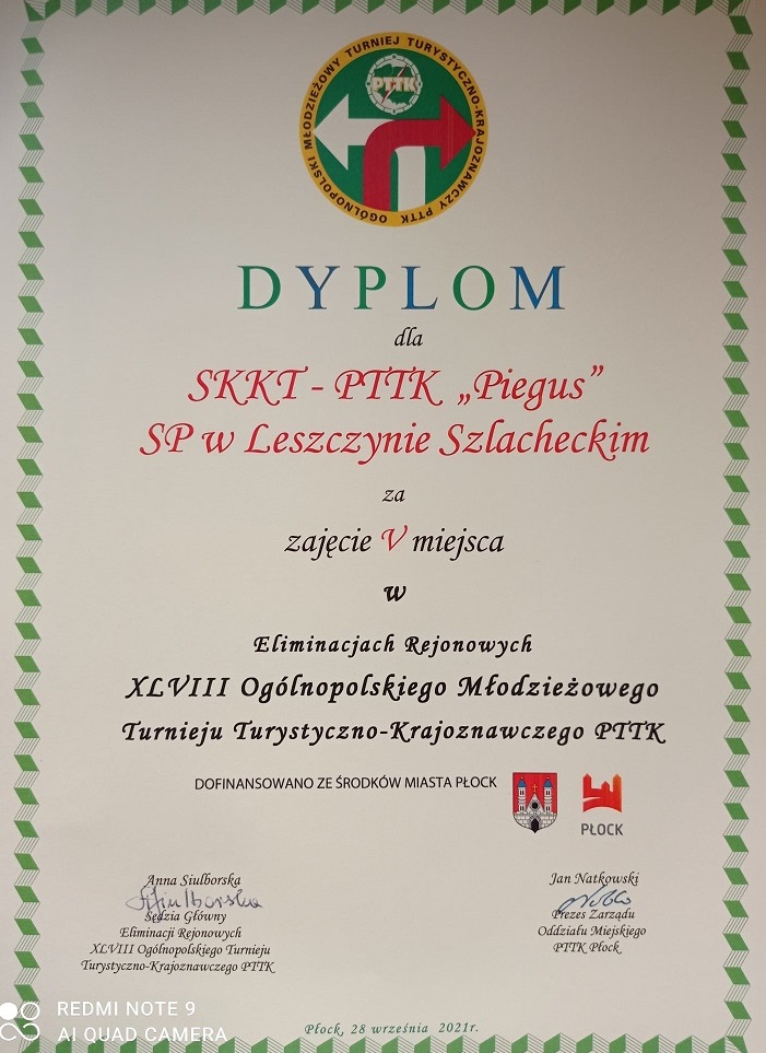 28.09.2021r. w OM PTTK w Płocku odbył się XLVIII Ogólnopolski Młodzieżowy Turniej Turystyczno-Krajoznawczy PTTK. Naszą szkołę reprezentowali uczniowie klasy VII Zosia, Ewa i Maciej, członkowie SKKT-PTTK „Piegus.” Pierwsza część turnieju dotyczyła znajomości Płocka, druga związana była z zasadami udzielania pierwszej pomocy.