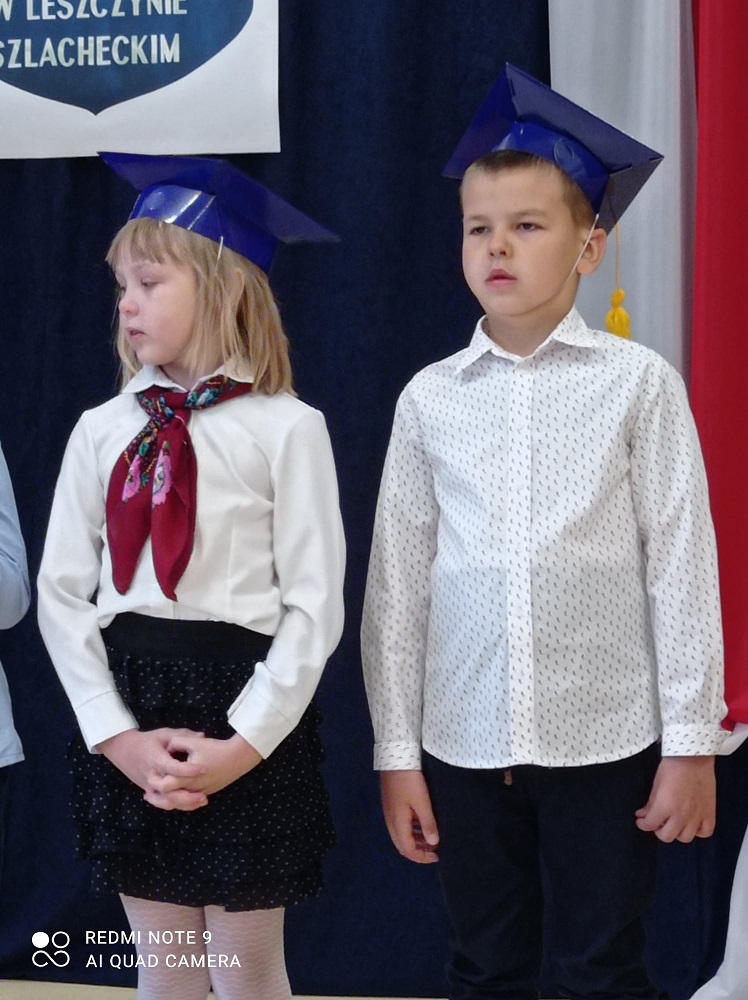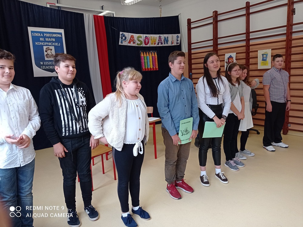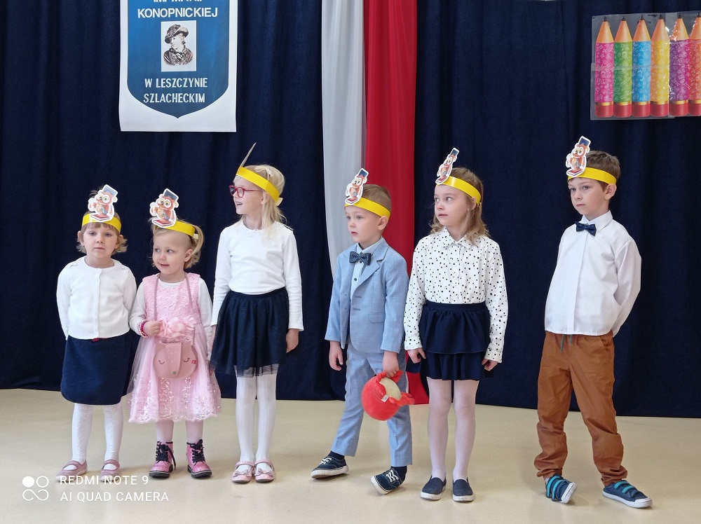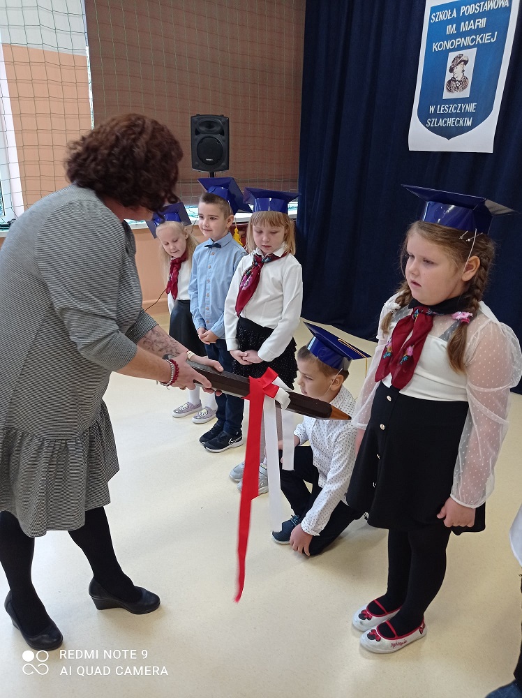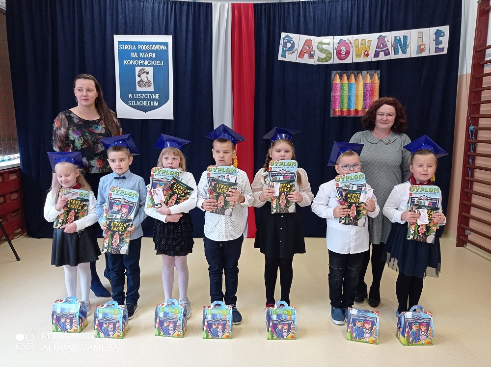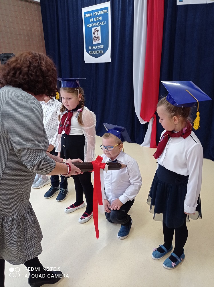 W Dniu Edukacji Narodowej w naszej szkole odbyło się ślubowanie uczniów klasy pierwszej - "Uczniem być to ważna sprawa i otwierać wiedzy drzwi...". Swoim znakomitym występem udowodnili, że zasługują na zaszczytne miano ucznia Szkoły Podstawowej im. M. Konopnickiej w Leszczynie Szlacheckim i możliwość posługiwania się pierwszym oficjalnym dokumentem – legitymacja szkolną. Kolejnym bardzo ważnym wydarzeniem tego dnia było pasowanie przedszkolaczków. Nasi debiutanci oprócz braw zostali obdarowani licznymi upominkami ufundowanymi przez: Wójta Gminy Bielsk Pana J.J. Rozkosza, Radę Rodziców i Panią Dyrektor. R. Jarzyńską.