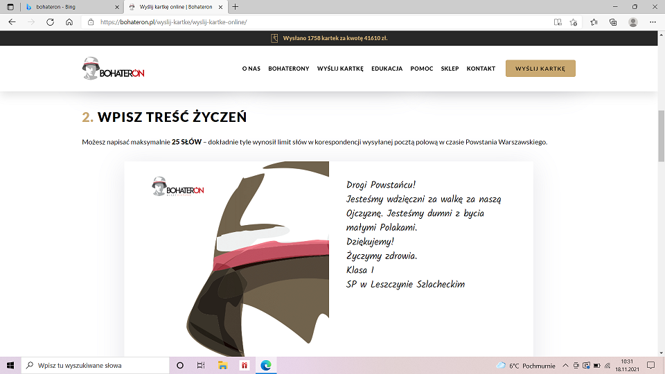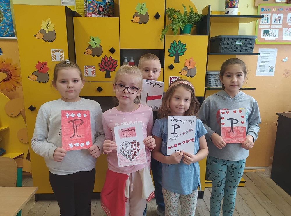 Klasa 1. po uważnym obejrzeniu przedstawienia kukiełkowego pt. "Niebajka o Powstaniu Warszawskim" ustaliła, że patriotą można być zawsze- również w czasie pokoju. Wysłała także kartkę on-line do żyjących Powstańców.