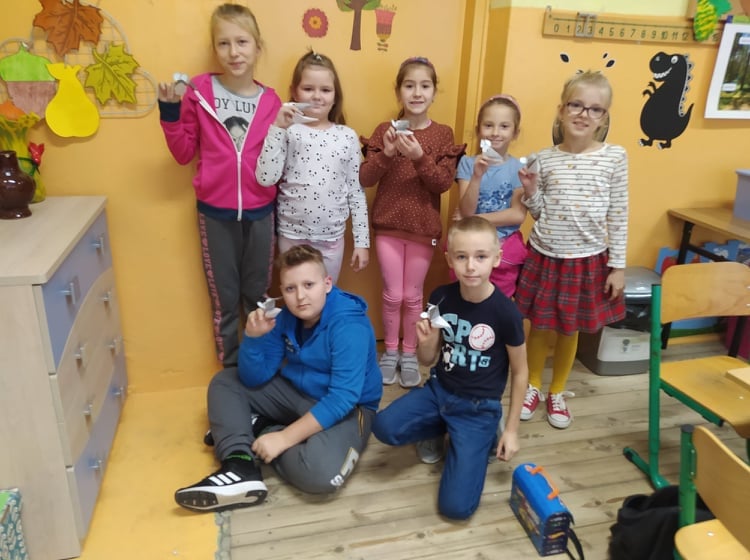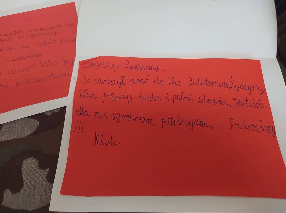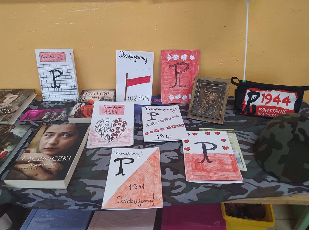 Klasa 2. i 3. również obejrzała "Niebajkę o Powstaniu Warszawskim", wykonała myszki wg scenariusza zaproponowanych zajęć. Zorganizowała wystawkę książek o powstaniu. Uczniowie przygotowali własnoręcznie kartki dla Powstańca wraz z życzeniami oraz znaczki okolicznościowe.