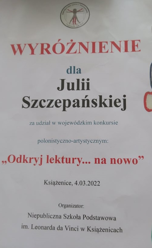 Julia Szczepańska uczennica klasy VIII otrzymała wyróżnienie w Wojewódzkim Konkursie Polonistyczno- Artystycznym „Odkryj lektury...na nowo” zorganizowanym przez Niepubliczną Szkołę Podstawową im. Leonarda da Vinci w Książenicach. Zadanie konkursowe polegało na wybraniu utworu z kanonu lektur obowiązkowych lub nieobowiązkowych dla II etapu edukacyjnego szkoły podstawowej i przełożeniu go na dowolny środek ekspresji.
