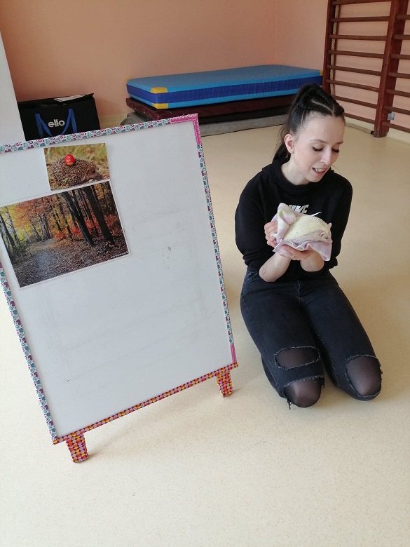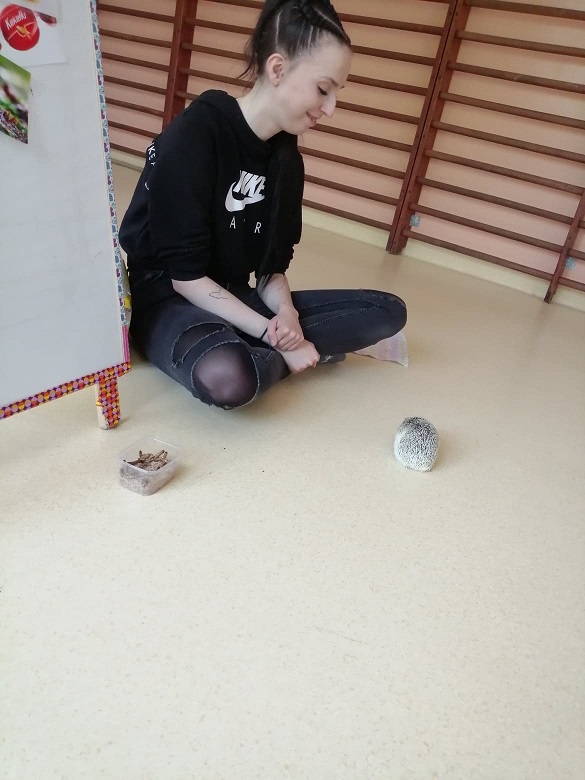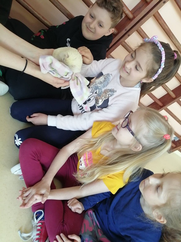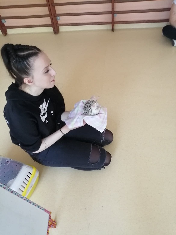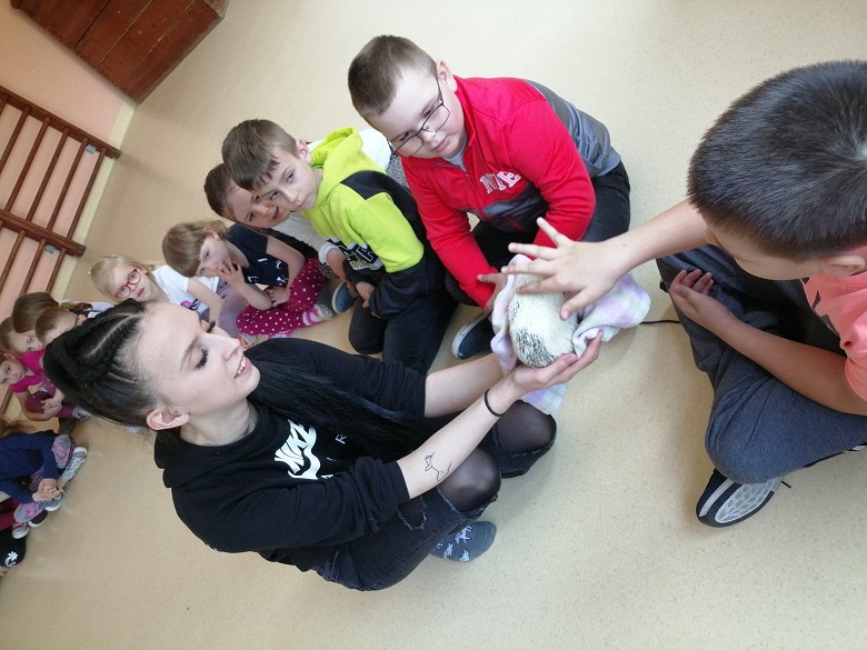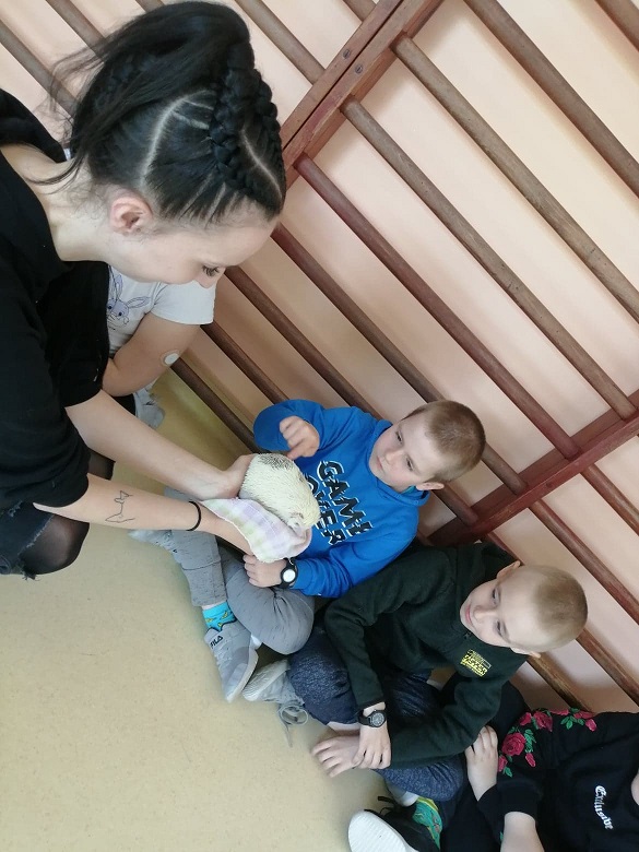 Lekcja przyrody dla dzieci z klas 0-3 z przemiłą prowadzącą i dwoma jeżami pigmejskimi - Śnieżynką i Balbinką. Uczniowie dowiedzieli się m.in. kilku ciekawostek na temat życia jeży.