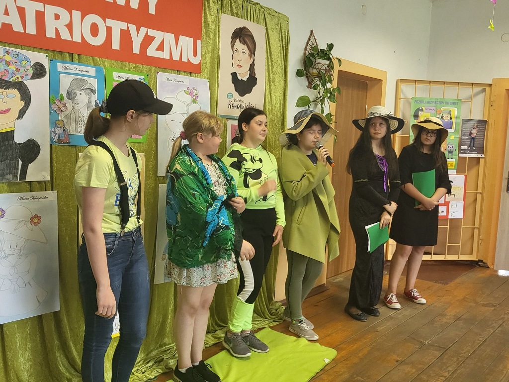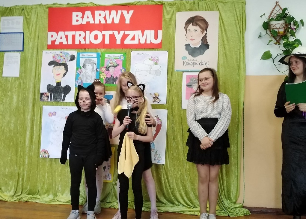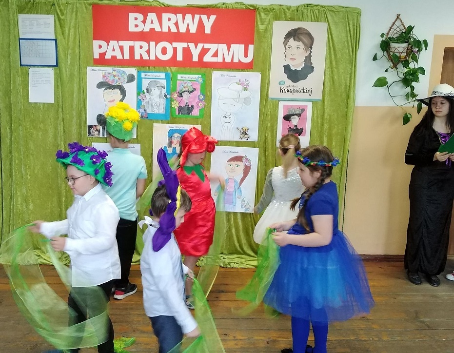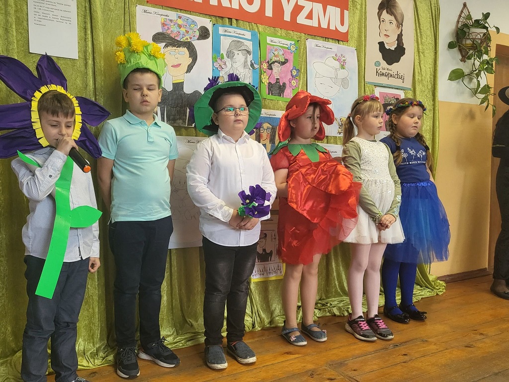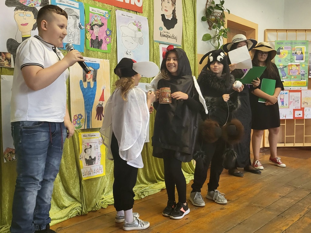23 maja przypada 180. rocznica urodzin Marii Konopnickiej - polskiej pisarki, poetki, tłumaczki, publicystki oraz patrona naszej szkoły. Sejm Rzeczypospolitej Polskiej doceniając literacki dorobek Marii Konopnickiej oraz jej wkład w działalność patriotyczną ustanowił 2022 Rokiem Marii Konopnickiej. W uchwale oceniono, że Konopnicka „była jedną z najwybitniejszych pisarek w historii polskiej”. My też dzisiaj pamiętaliśmy o naszym patronie. Młodsi uczniowie zaprezentowali utwory wyjątkowej pisarki. Przedszkolaki jako krasnoludki opowiedziały niezwykłą „bajkę czy nie bajkę o krasnoludkach, które na pewno są na świecie!”. Pierwszoklasiści jako sasanki, stokrotki, niezapominajki, konwalie i maki zachwyciły pięknym widokiem i przybliżyli wiersz „Nasze kwiaty”. Natomiast uczniowie z klasy II i III przedstawili „Komedię przy myciu”. Biedne kotki Filuś i Żuczek wpadły w ręce Zosi i Julki, oj było krzyku co niemiara, ale „ Kto się myje, ten jest gładki...”. W kolejnym utworze „ Muchy Samochwały” muchy zadzierające nosa i przechwalające się skończyły w pajęczej sieci. Uczennice z kl. IV- VI przedstawiły „Stefka Burczymuchę” kolejnego chwalipiętę oraz „Pana Zielonkę”.