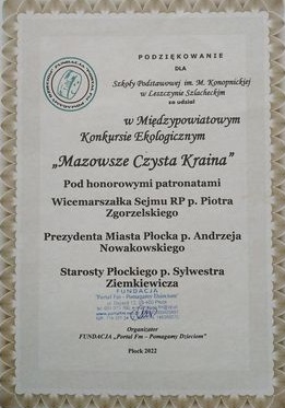 Nasza szkoła wzięła udział w Międzypowiatowym Konkursie Ekologicznym „Mazowsze Czysta Kraina”, którego organizatorem jest Fundacja „Portal Fm – Pomagamy Dzieciom”. Honorowy patronat nad konkursem objęli: Wicemarszałek Sejmu RP p. Piotr Zgorzelski, Prezydent Miasta Płocka p. Andrzej Nowakowski i Starosta Powiatu Płockiego p. Sylwester Ziemkiewicz. Konkurs polegał na przeprowadzeniu zbiórki surowców wtórnych (np. plastikowe nakrętki) oraz fantów do Charytatywnego Bazarku. Za udział w konkursie otrzymaliśmy pamiątkowy dyplom oraz puchar.