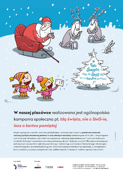 Społeczność naszej szkoły wzięła udział w kampanii społecznej „Idą święta, nie o sms-ie, lecz o kartce pamiętaj" Fundacji Dbam o Mój Z@sięg. Celem akcji było zwrócenie uwagi na ważność relacji międzyludzkich w świecie zdominowanym przez nowe technologie, wzmacnianie więzi rodzinnych, rozwijanie kreatywności, kultywowanie tradycji świąt Bożego Narodzenia.