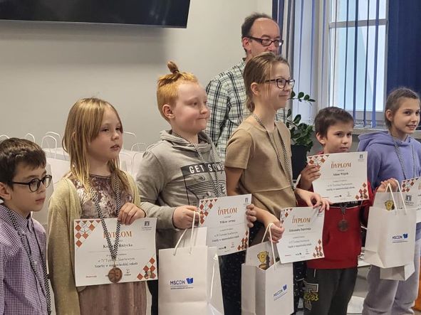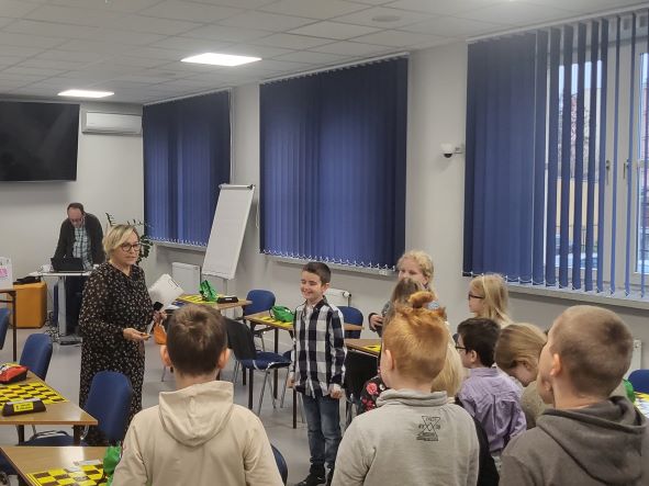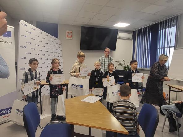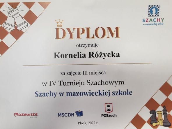 Po 7 fascynujących rundach w kategorii klas II Paweł zajął I miejsce, a Kornelia - III. W kategorii klas III Lenka zajęła II miejsce. Dodatkową nagrodą jest udział w turnieju szachowym 8 grudnia w Warszawie.