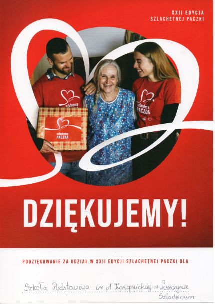 Serdecznie dziękujemy wszystkim Darczyńcom: Pani Dyrektor, Rodzicom, Nauczycielom i Uczniom, którzy przyczynili się do zebrania darów w akcji. Dziękujemy za pomoc, zaangażowanie i poświęcony czas. Bez Was nie byłoby Szlachetnej Paczki.