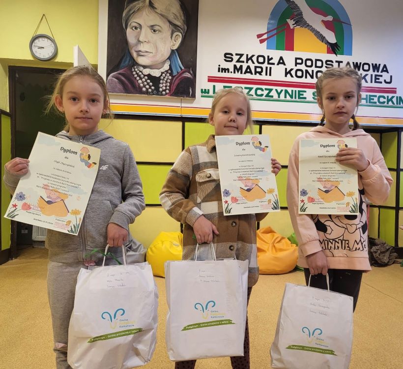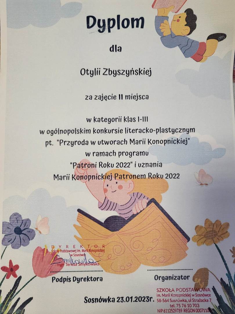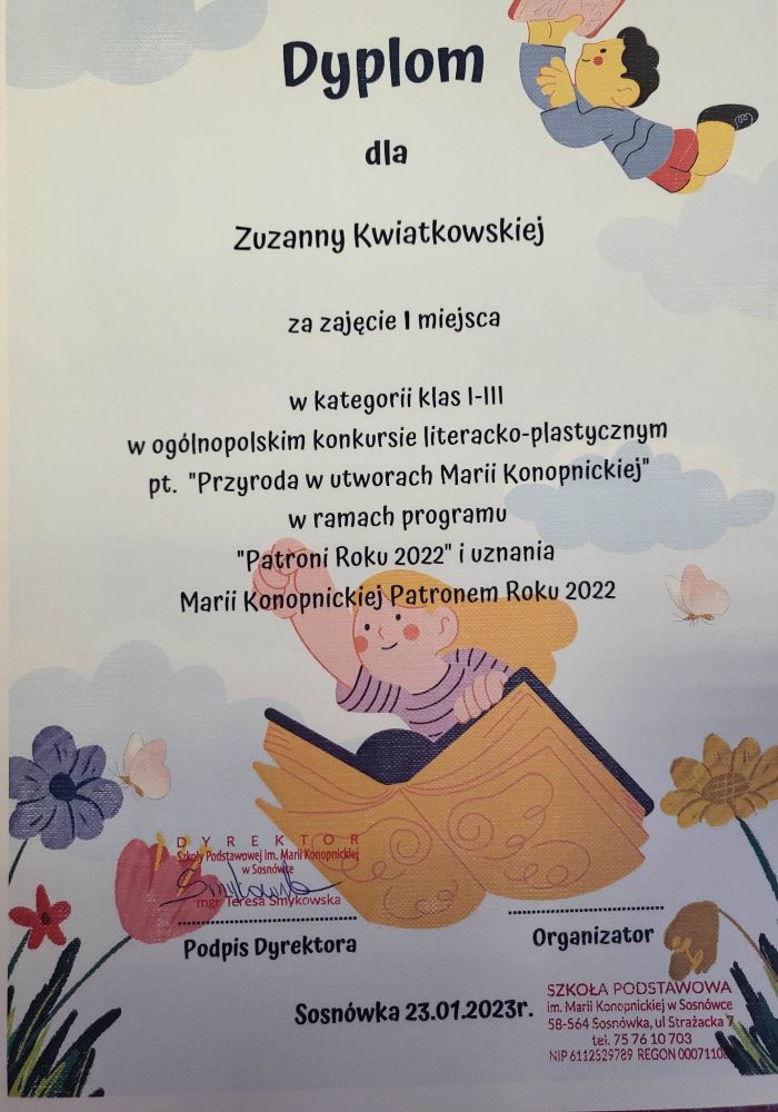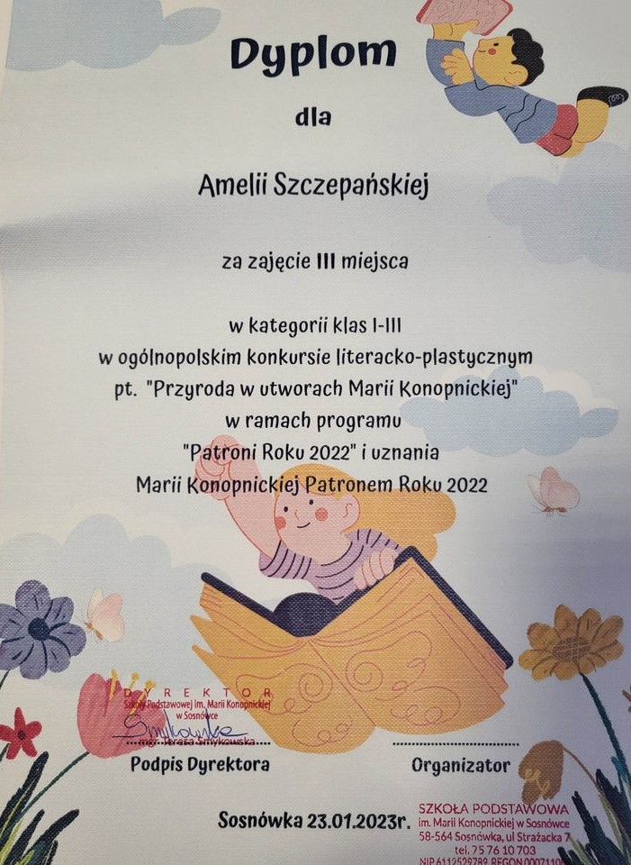 Uczniowie klas I-III wzięli udział w ogólnopolskim konkursie literacko-plastycznym pt. „Przyroda w utworach Marii Konopnickiej” w ramach programu „Patroni Roku 2022” i uznania Marii Konopnickiej Patronem Roku 2022 organizowanym przez Szkołę Podstawową im. M. Konopnickiej w Sosnówku. Zuzia z kl.II zajęła I miejsce za pracę „Nasza zima zła”, Otylka z kl. I zajęła II miejsce za pracę „Co słonko widziało” i Amelka z kl. I zajęła III miejsce za pracę „Jesień”. GRATULUJEMY!