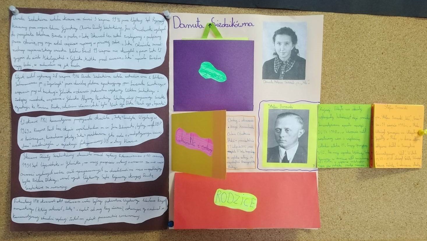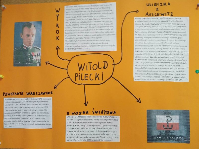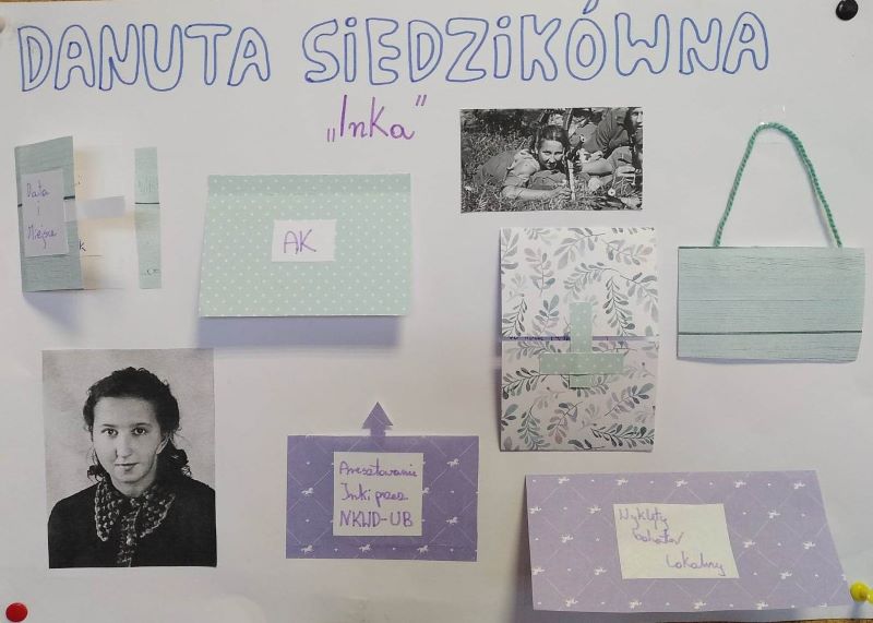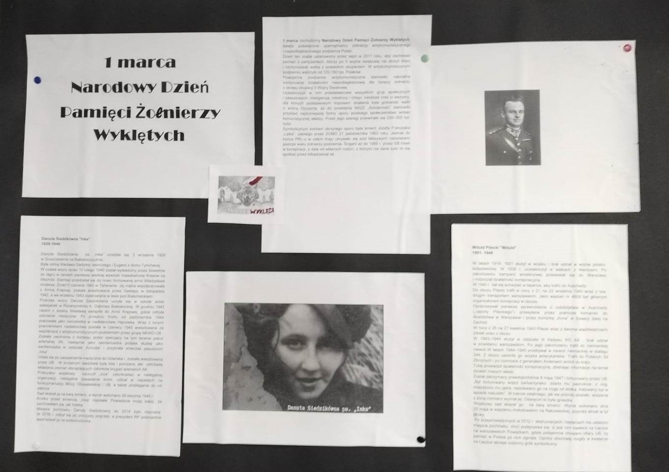 "Żołnierze Wyklęci” to uczestnicy polskiego zbrojnego podziemia niepodległościowego, którzy od 1944 r. walczyli przeciwko sowieckiej okupacji i narzuconej przez Moskwę władzy komunistycznej. Przez zwalczający ich reżim nazywani byli „bandytami” i „faszystami”. Zakłamywano ich historię, wypaczano cel, o który walczyli, starano się wymazać ich ze społecznej pamięci. Uczniowie wykonali lapbooki, plakaty poświęcone m. in.: Witoldowi Pileckiemu, Danucie Siedzikównie "Ince".