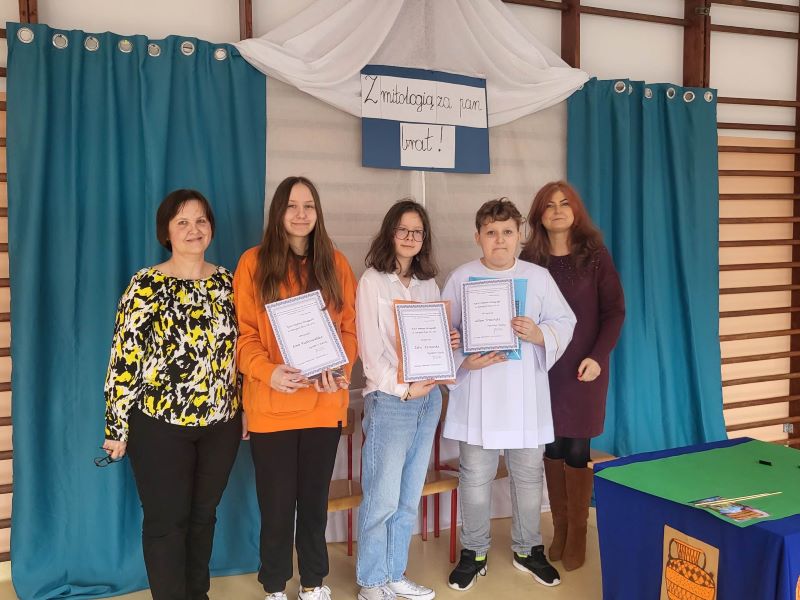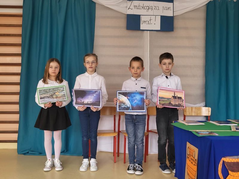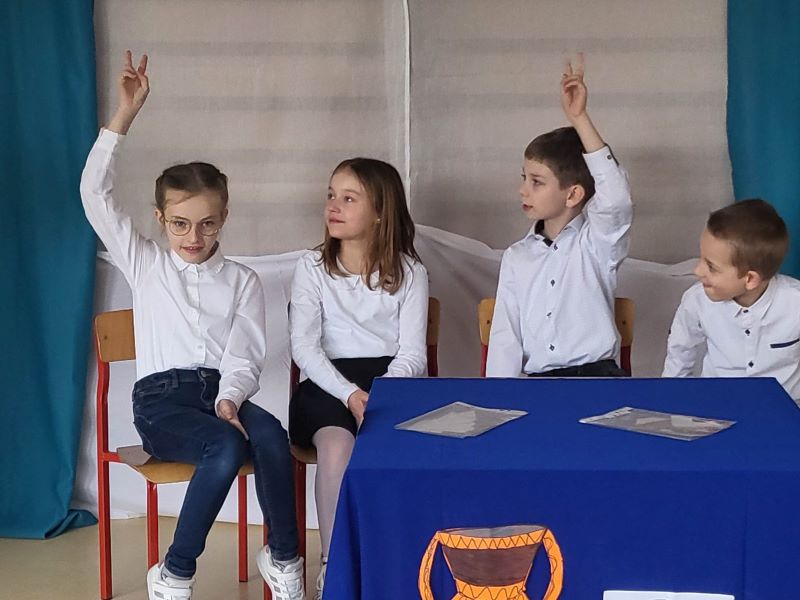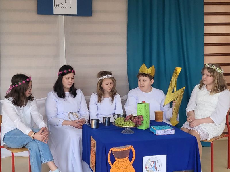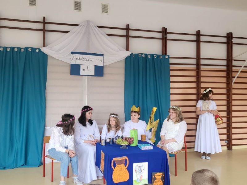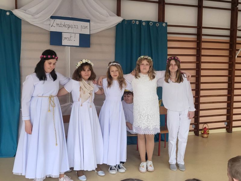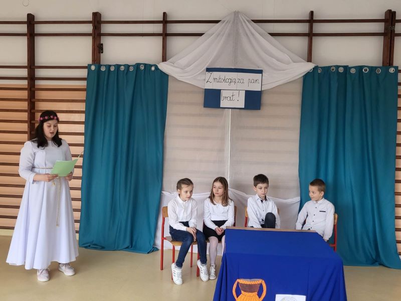 W ramach obchodów Dnia Teatru uczniowie naszej szkoły zaprezentowali inscenizację pt. „Parysowy wyrok”. Wściekła i naburmuszona Eris (w tę postać wcieliła się Amelka z klasy IV) przybyła na Olimp. Wcześniej nie była zapraszana na uczty i postanowiła popsuć zabawę bogom, boginkom i herosom. Rzuciła jabłko z napisem „Dla najpiękniejszej”, żeby skłócić trzy boginki. Wszechmocny i gromowładny Zeus (zagrał go czwartoklasista Julek ) postanowił, że spór rozstrzygnie pasterz Parys ( w tej roli dobrze odnalazł się Arek z kl. VIII). Hera ( Julia ), Atena ( Ola) i Afrodyta ( Maja z klasy VI) próbowały przekupić jurora. Argumenty Afrodyty opisujące piękną Helenę najbardziej przekonały Parysa. I tak Zeus ogłosił wynik pierwszych w dziejach świata wyborów miss. Najpiękniejszą została Afrodyta.