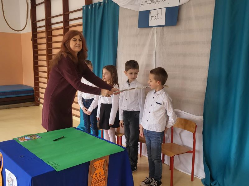 W drugiej części spotkania uczniowie klasy pierwszej zdali egzamin na czytelnika szkolnej biblioteki. Wykonali wszystkie zadania- ułożyli puzzle, odgadli zagadki i udzielili poprawnych odpowiedzi na pytania. Ceremonii pasowania na pełnoprawnego czytelnika dokonała dyrektor szkoły p. J. Bojanowska. Pierwszoklasiści otrzymali pamiątkowe dyplomy i książki. Życzymy im, żeby „kochali wchodzić do książkowych ogrodów oraz by bez trudu odnajdywali w nich to, czego szukają. A czas spędzony na czytaniu miał w sobie czar najwonniejszych kwiatów”.