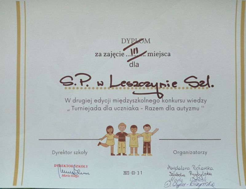 Nadia z klasy siódmej reprezentowała naszą szkołę podczas II edycji Międzyszkolnego konkursu „Turniejada dla uczniaka – Razem dla autyzmu!” zorganizowanego przez SP im. Wł. Broniewskiego w Bielsku. 2 kwietnia obchodzimy Światowy Dzień Świadomości Autyzmu. Głównym celem konkursu była popularyzacja wiedzy o funkcjonowaniu osób ze spektrum autyzmu. Uczestnicy przekonali się, że nie jest to takie łatwe. Nasza reprezentantka zajęła III miejsce. Gratulujemy!!!