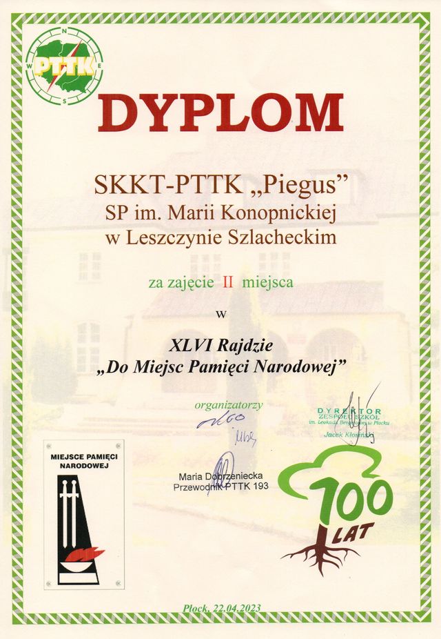 22 kwietnia „Piegusy” wzięły udział w XLVI Rajdzie Do Miejsc Pamięci Narodowej. Trasa liczyła 9 km. Celem wędrówki były miejsca pamięci narodowej oraz uczczenie 100. rocznicy ZS im. Leokadii Bergerowej w Górach. Na mecie czekała pyszna grochówka oraz wiele atrakcji sportowych. Mieliśmy możliwość zwiedzenia szkoły i poznania jej 100-letniej historii. „Piegusy” w kategorii szkół podstawowych zajęły II miejsce.