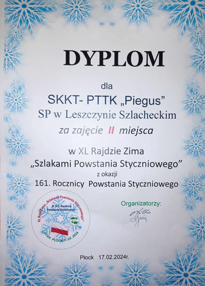 Za nami Rajd Zima, który poświęcony był 161 rocznicy Powstania Styczniowego. Pokonaliśmy 5km trasę po najbardziej urokliwej części Płocka. W gronie Piegusów powitaliśmy Filipka z klasy I. Pogoda dopisała pomimo porannego deszczu, humory też. W kategorii szkół podstawowych zajęliśmy II miejsce.