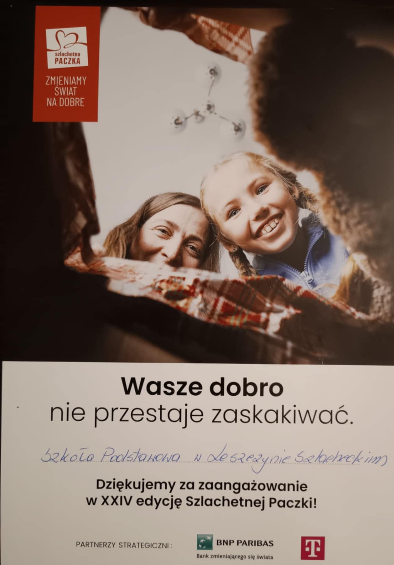 Serdecznie dziękujemy wszystkim Darczyńcom: Pani Dyrektor, Rodzicom, Nauczycielom, Uczniom i Pracownikom szkoły, którzy przyczynili się do zebrania darów w akcji. Dziękujemy p. Wojciechowi Szulborskiemu Prezesowi OSP w Leszczynie Szlacheckim za pomoc w dostarczeniu paczek do punktu. Dziękujemy za ofiarowany czas, za szlachetność, dobro i otwartość na drugiego człowieka. Bez Was nie byłoby Szlachetnej Paczki.