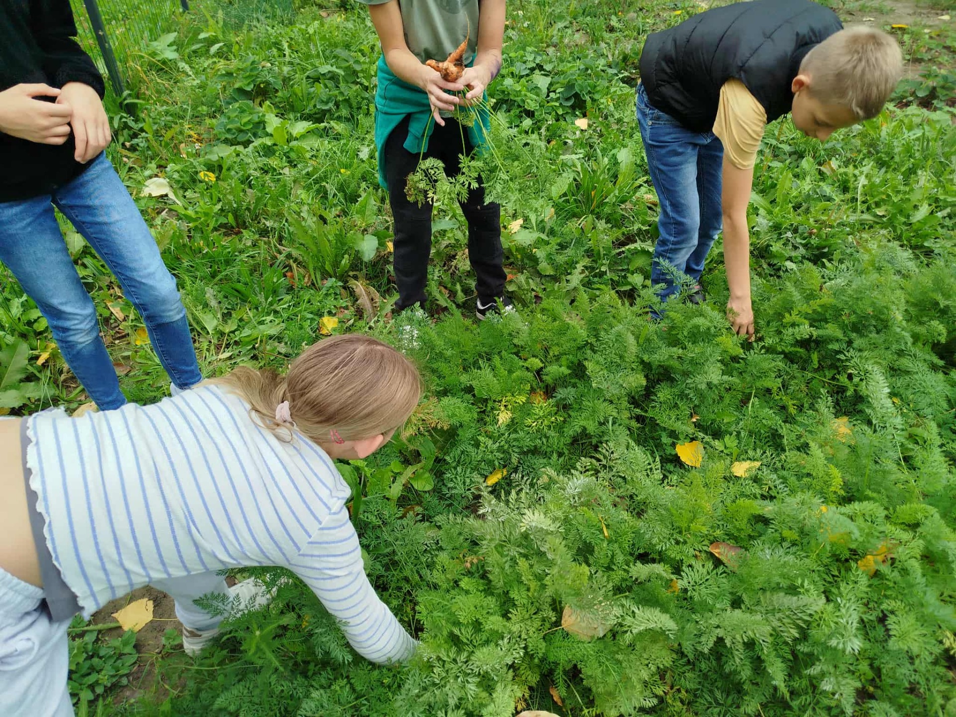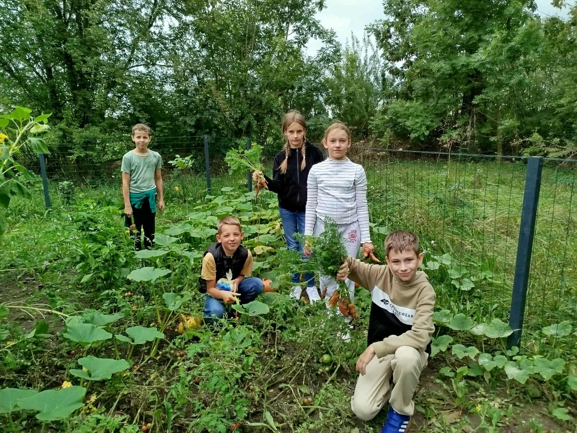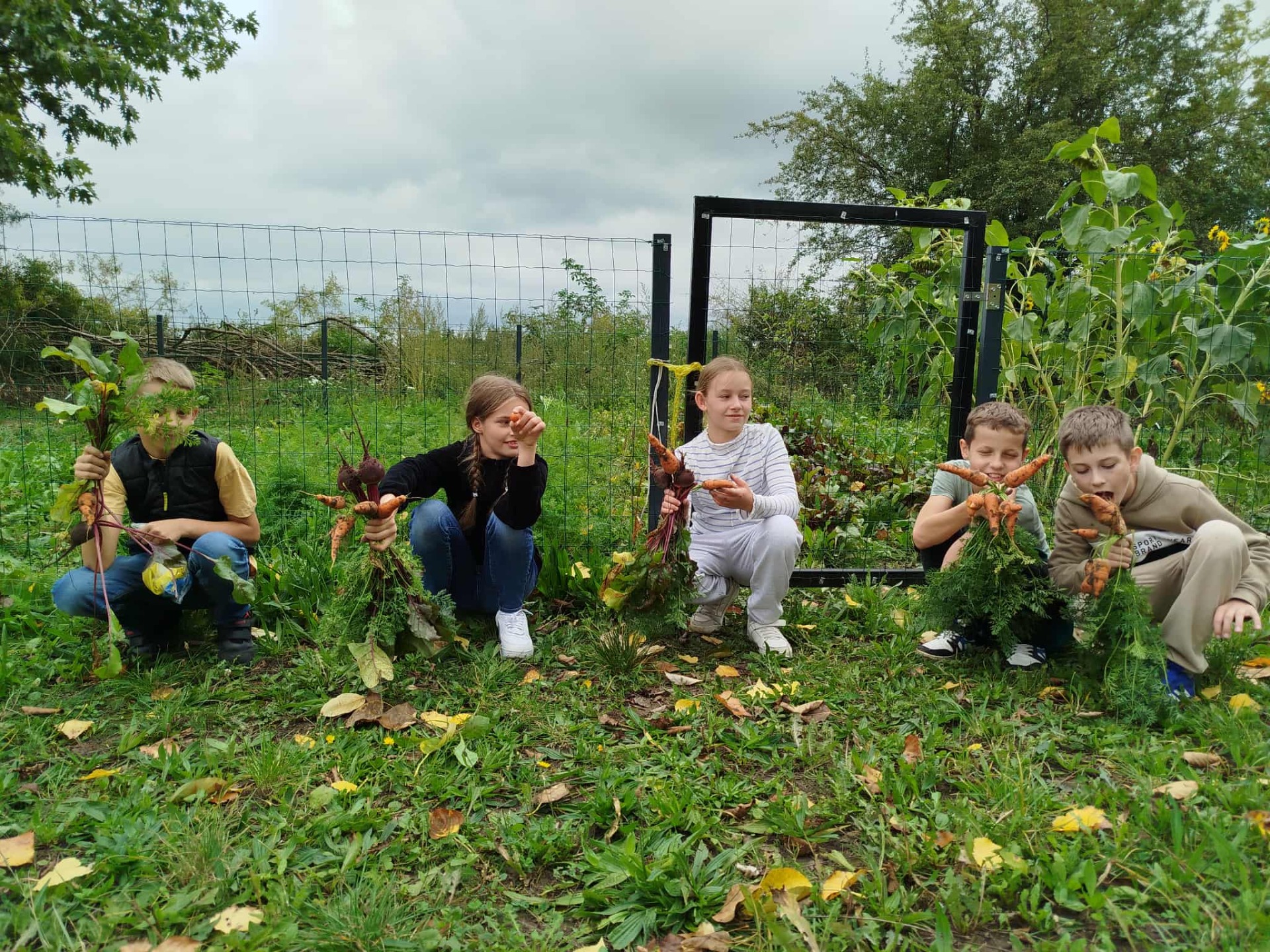 Klasy czwarta w ramach edukacji zdrowotnej odwiedziła ekogrządkę, którą utworzyliśmy wiosną wspólnie z paniami z KGW w Leszczynie Szlacheckim w ramach wspólnego projektu "Chodź z nami do EKOgrządki!".