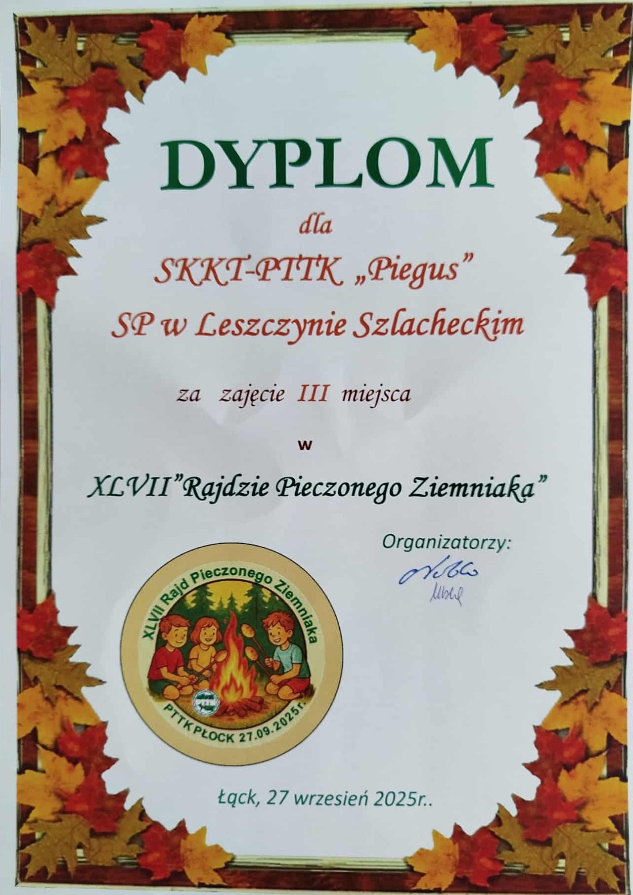 27 września "Piegusy" uczestniczyły w XLVII Rajdzie Pieczonego Ziemniak zorganizowanym przez OM PTTK w Płocku i Nadleśnictwo Łąck. Trasa liczyły 12 km i prowadziła przez urokliwe leśne zakątki. Na trasie rajdu towarzyszył nam pracownik Nadleśnictwa Łąck, który opowiadał o znaczeniu lasów dla środowiska, na czym polega praca leśniczego. Na mecie czekały pyszne pieczone ziemniaczki. "Piegusy" w kategorii szkół podstawowych zajęły III miejsce.