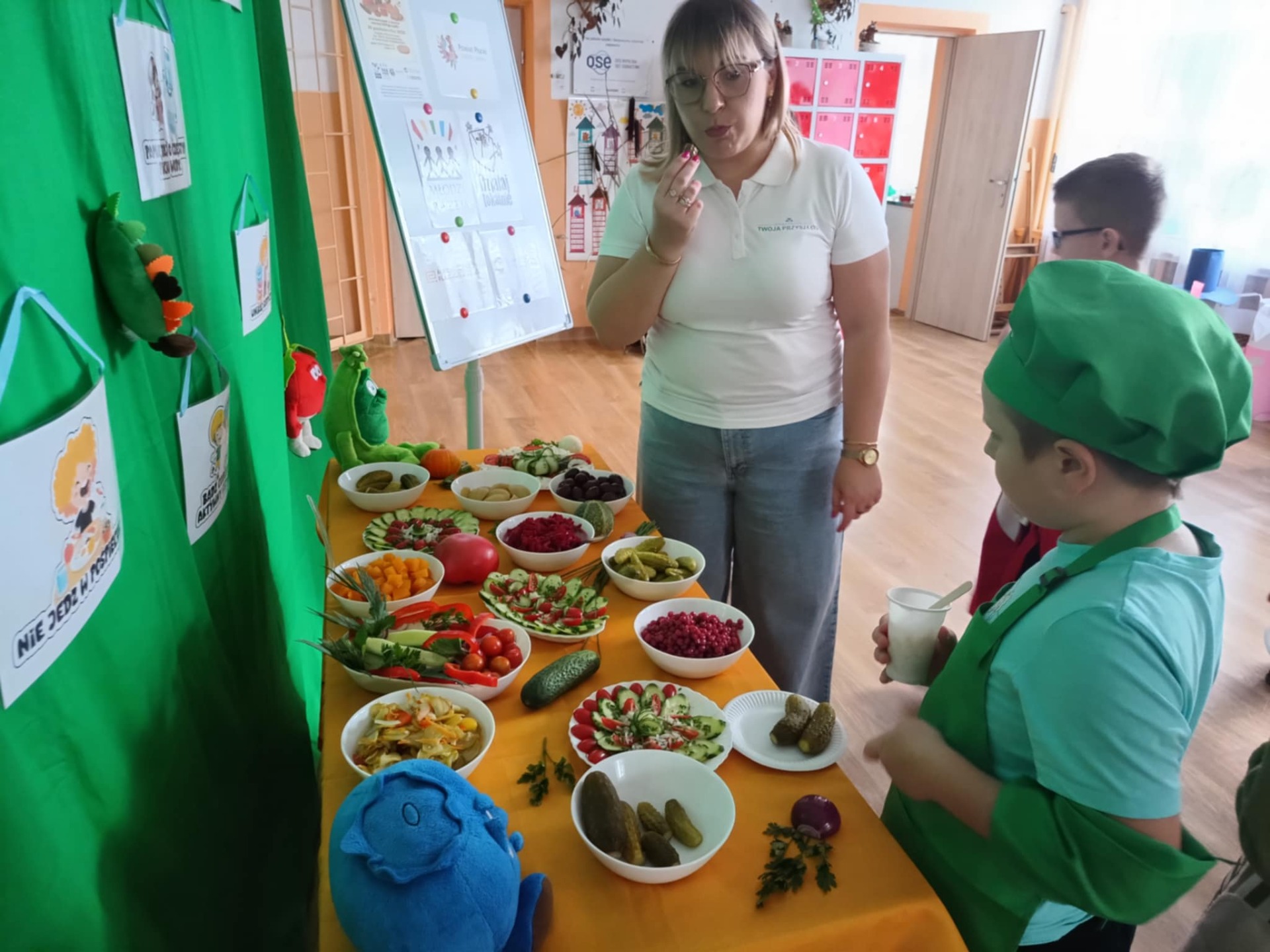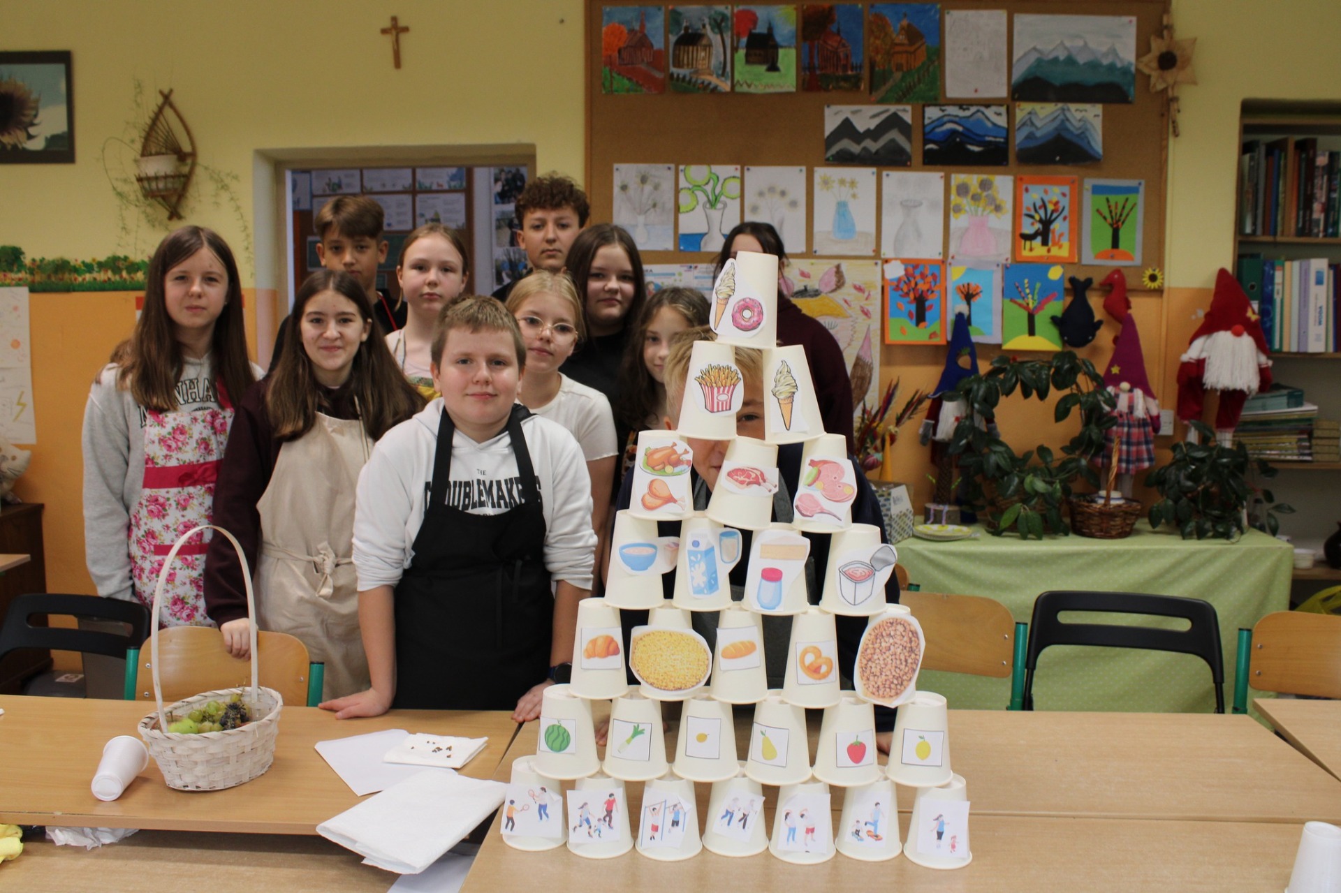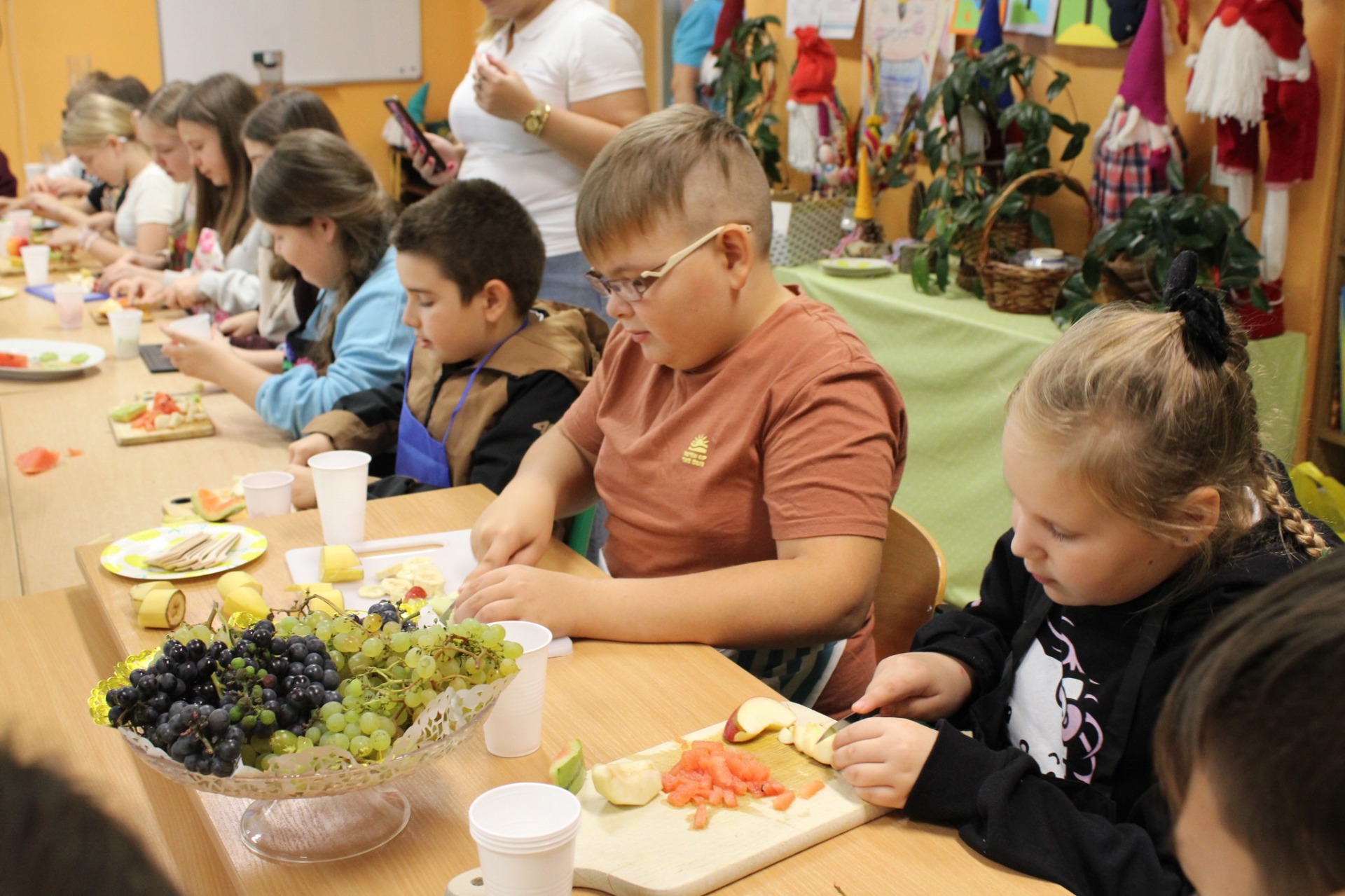 Przypomnieliśmy sobie budowę piramidy zdrowego żywienia, że każdy dzień powinniśmy zaczynać od śniadania, w ciągu dnia powinniśmy spożywać pięć posiłków, a najwięcej witamin zawierają warzywa i owoce z własnej grządki. Najwięcej frajdy sprawiło nam samodzielne przygotowanie sałatki owocowej oraz degustacja soków owocowo-warzywnych przygotowanych z darów naszej ekogrządki.