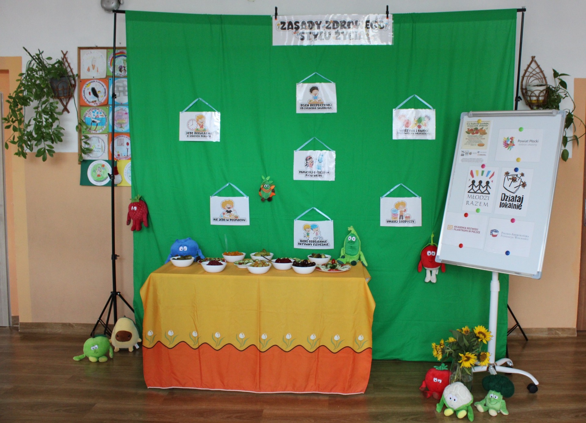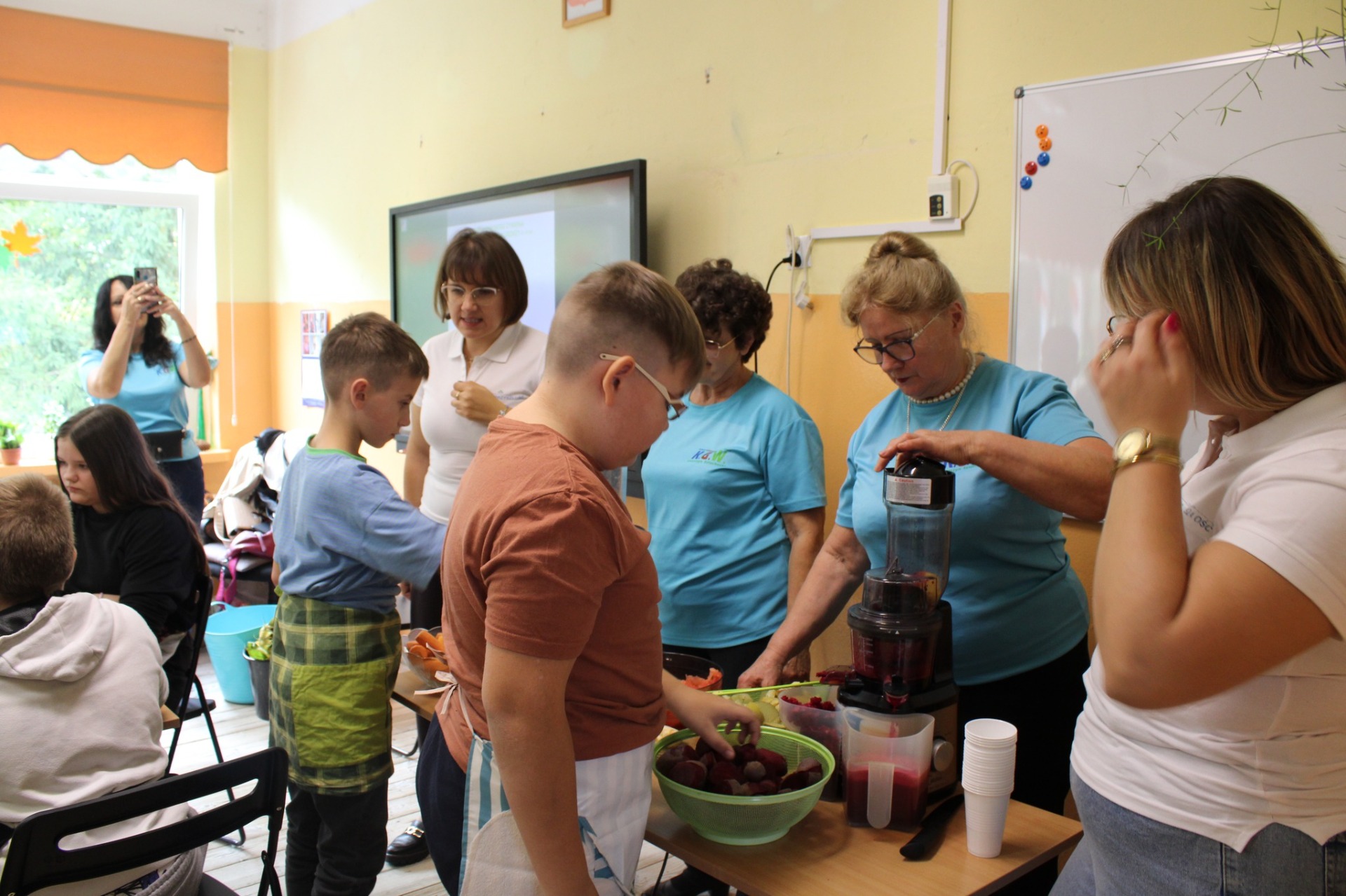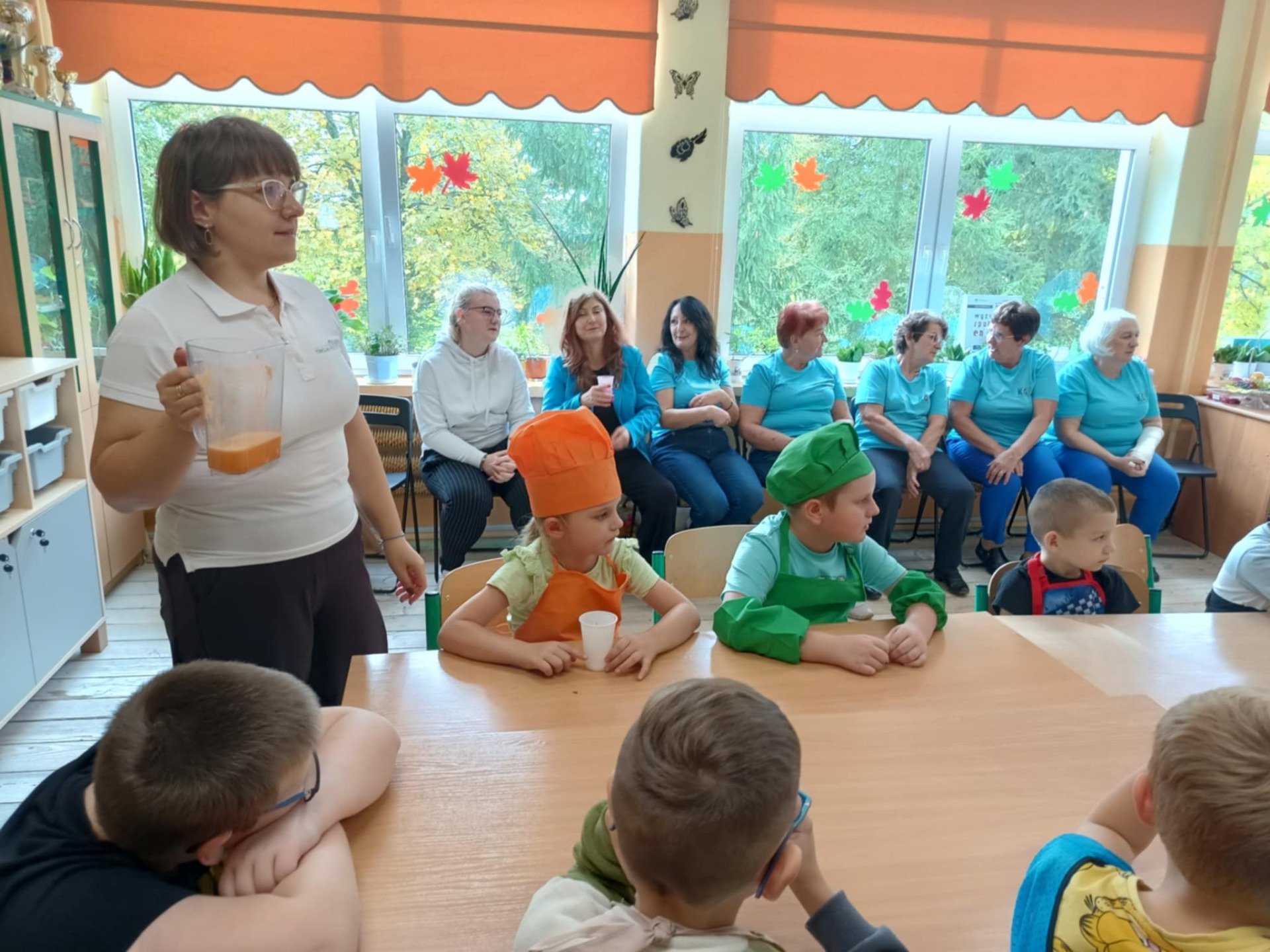 Przypomnieliśmy sobie budowę piramidy zdrowego żywienia, że każdy dzień powinniśmy zaczynać od śniadania, w ciągu dnia powinniśmy spożywać pięć posiłków, a najwięcej witamin zawierają warzywa i owoce z własnej grządki. Najwięcej frajdy sprawiło nam samodzielne przygotowanie sałatki owocowej oraz degustacja soków owocowo-warzywnych przygotowanych z darów naszej ekogrządki.