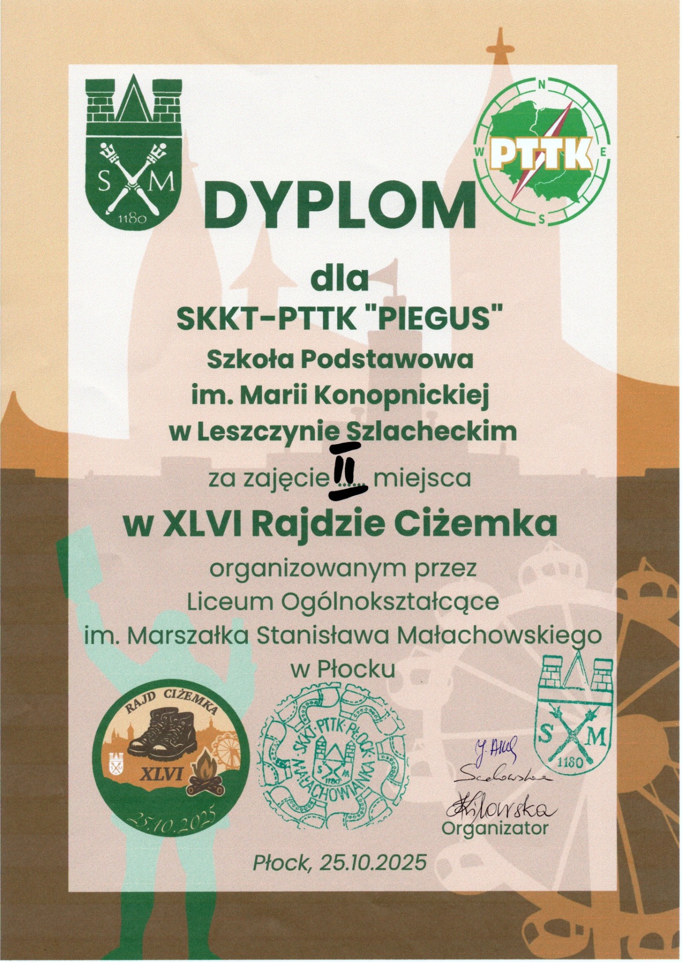 W sobotę 25 października „Piegusy” uczestniczyły w XLVI Rajdzie „Ciżemka” zorganizowanym przez OM PTTK w Płocku oraz SKKT-PTTK „Małachowianka”. W kategorii szkół podstawowych Piegusy zajęły II miejsce.