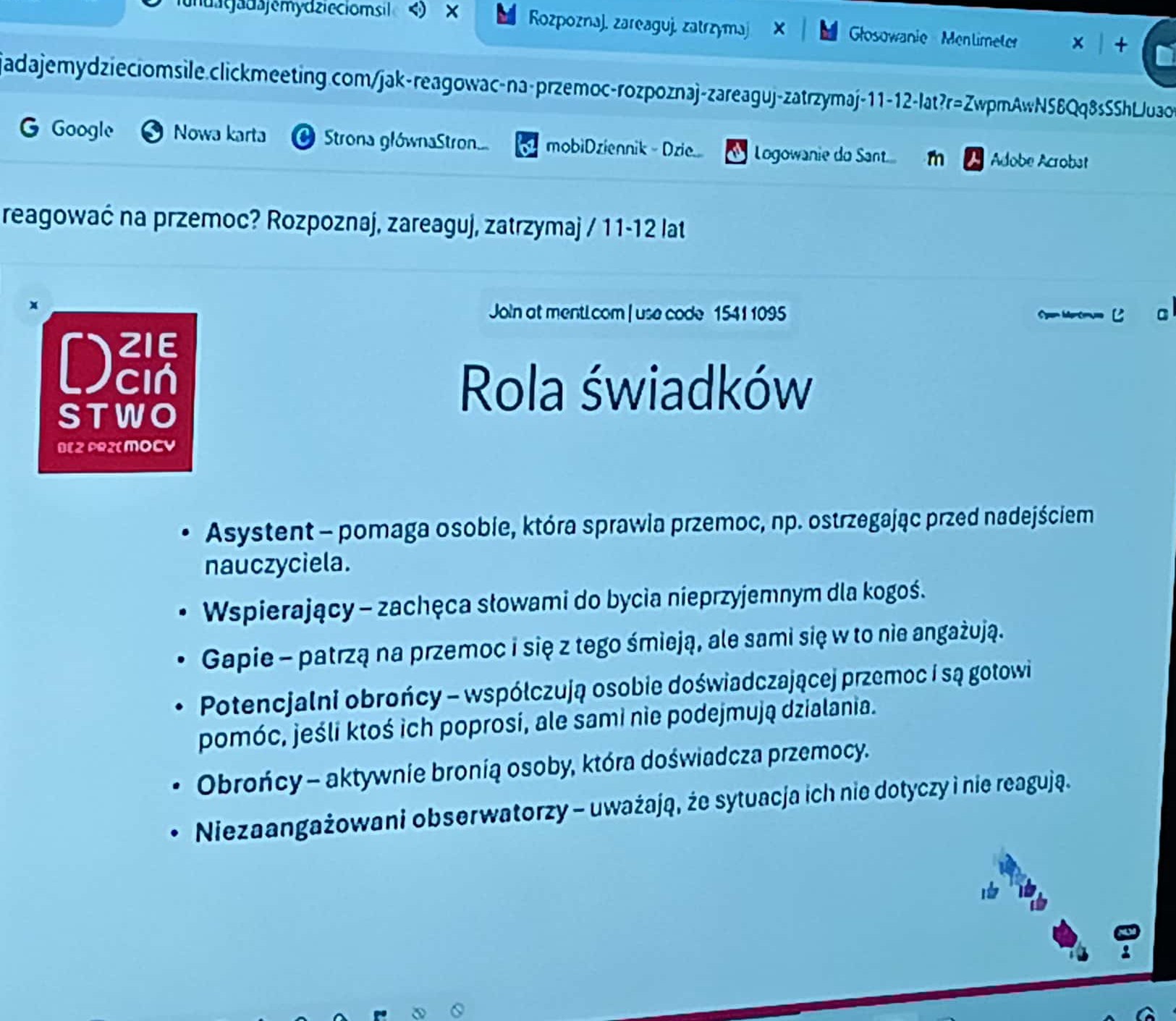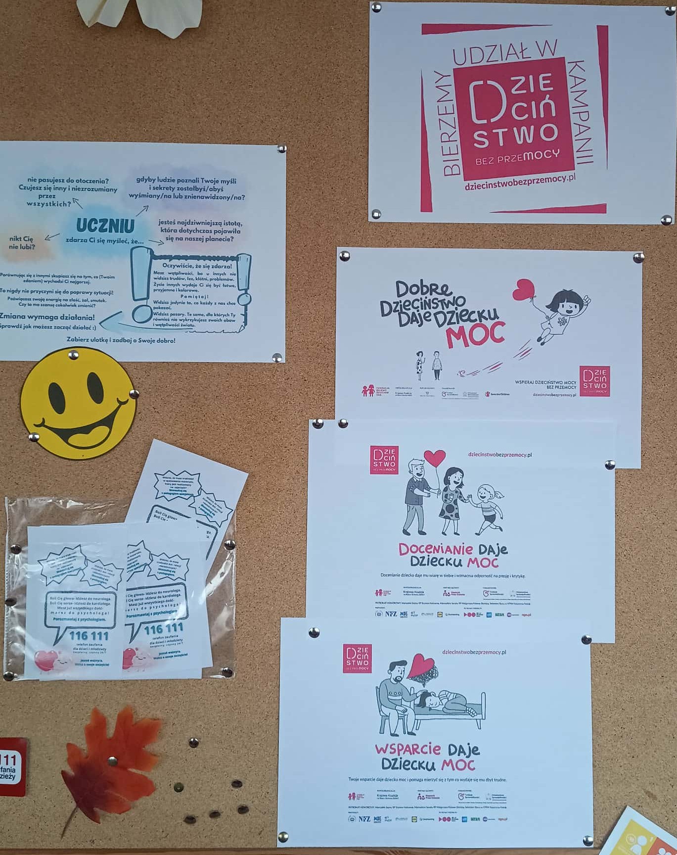 W naszej szkole zakończyła się kampania „Dzieciństwo bez Przemocy”, której celem było zwiększenie świadomości uczniów, nauczycieli i rodziców na problem przemocy wobec dzieci, umiejętności unikania zagrożeń, szukania pomocy, czy reagowania na przemoc. W ramach akcji odbyły zajęcia z wychowawcą, lekcje online Fundacji Dajemy Dzieciom Siłę dla uczniów, webinary dla nauczycieli i rodziców. W klasach i na korytarzach pojawiły się plakaty i gazetki promujące szacunek, empatię i reagowanie na krzywdę innych.