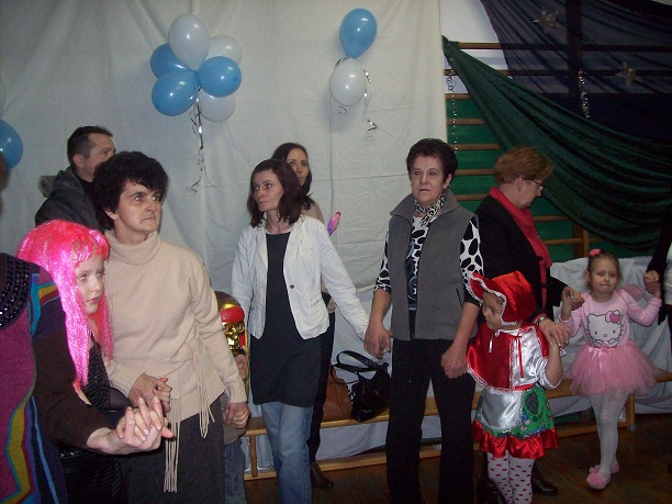 Później rozpoczęła się zabawa. Większość uczniów pomyślała o przebraniu. Na sali było bardzo kolorowo: barwne stroje, peruki, makijaże, dodatki: skrzydełka, różdżki, kaski, hełmy. Pląsały: wróżki, postacie z bajek, wojownicy. Dziadkowie bawili się z wnuczętami, królowała muzyka z różnych epok. Węże, wspólne zabawy, w kółkach, w parach integrowały najmłodszych i najstarszych. Dominowała wesoła atmosfera. Tradycyjnie nastąpiło również przekazanie korony przez ubiegłorocznego króla i królową zwycięzcom tegorocznego balu. Wygrała przebrana za wróżkę Zuzia Parzęcka z oddziału przedszkolnego i uczeń kl. III Kacper Stępień przebrany za Elvisa Presleya.Babcie i dziadkowie mieli również okazję ze sobą porozmawiać w czasie słodkiego poczęstunku.